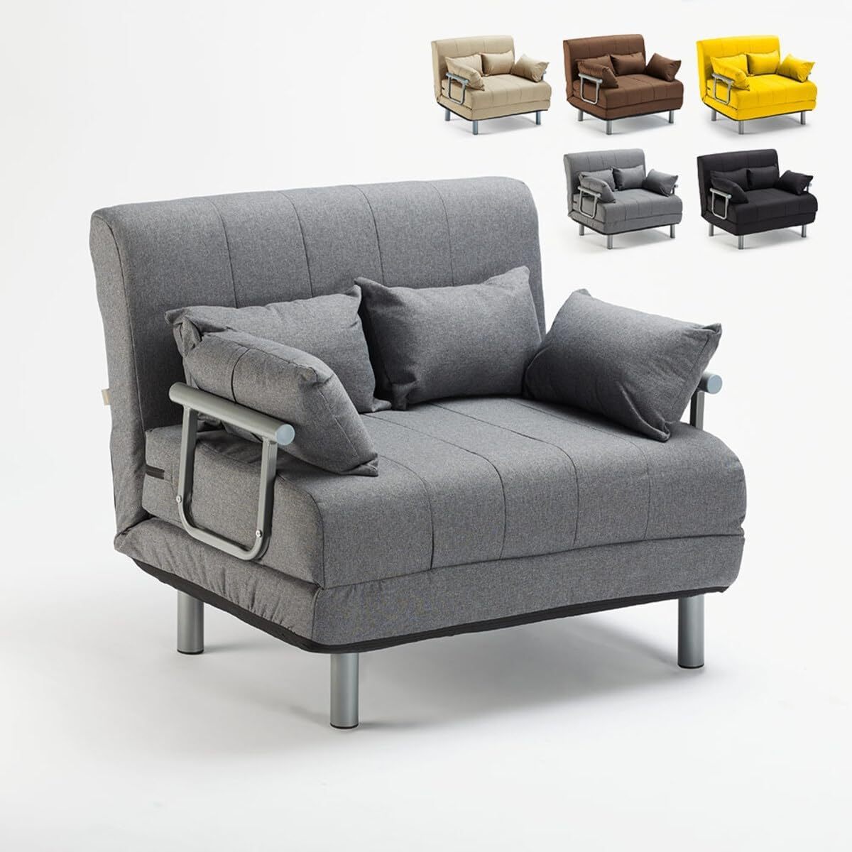 Dimensioni sedia: 100 x 60 x 83 cm (larghezza x profondità x altezza) Dimensioni del letto: 98 x 192 cm (larghezza x lunghezza) Spessore del materasso: 12 cm Altezza seduta dal pavimento: 47 cm Struttura in metallo e rete di supporto Seduta e schienale imbottiti in schiuma Materasso in poliestere Apertura con meccanismo pieghevole per transizione dalla poltrona al letto Sedile reclinabile multi-posizione 4 cuscini inclusi